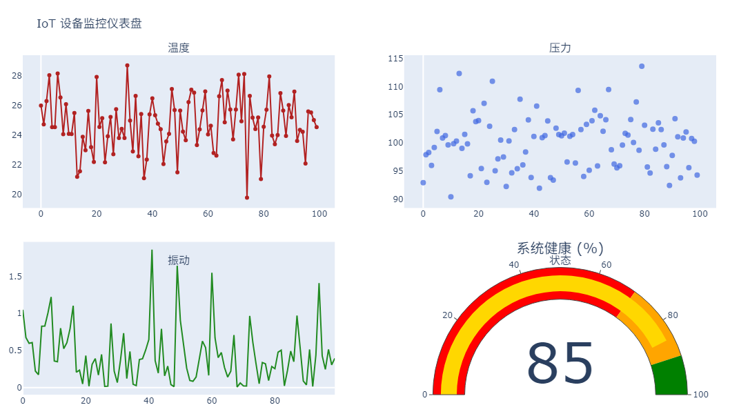 这个示例采用自由布局实现主监控图+4个状态指标环绕。- import plotly.graph_objects as go