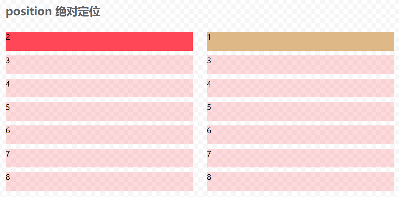 复制代码 默认的显示效果如下图左侧,定位的子元素 2 会遮挡住子元素 1。