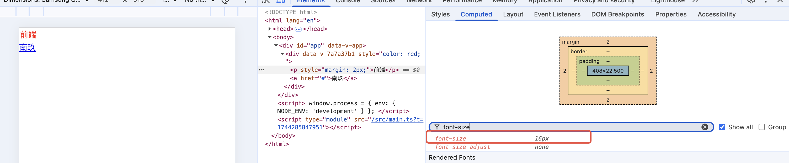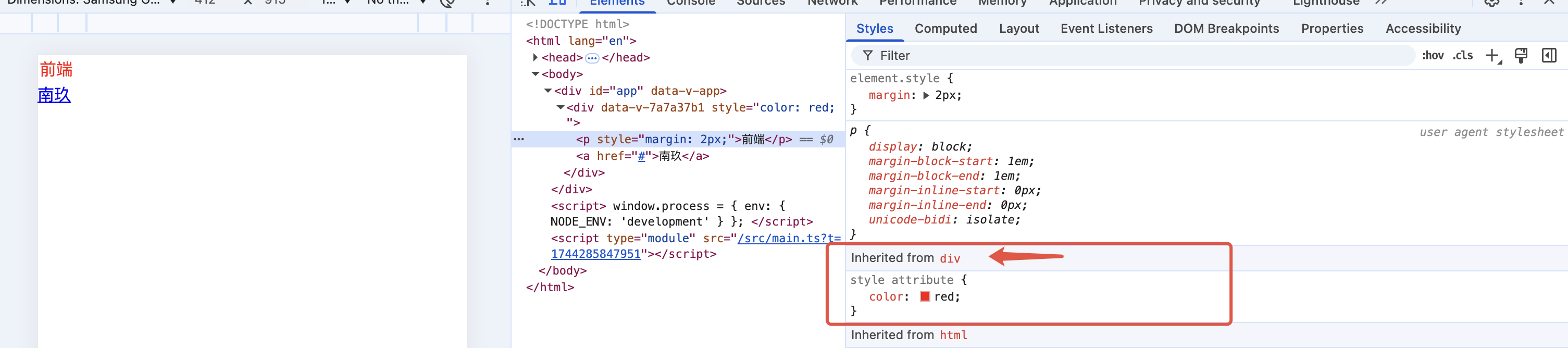 同样还是上面的代码,我们可以看到对于p标签我们既没有声明他的文字颜色,用户代理样式表同样也没声明文字颜色,那么它的红色是从哪来的呢?