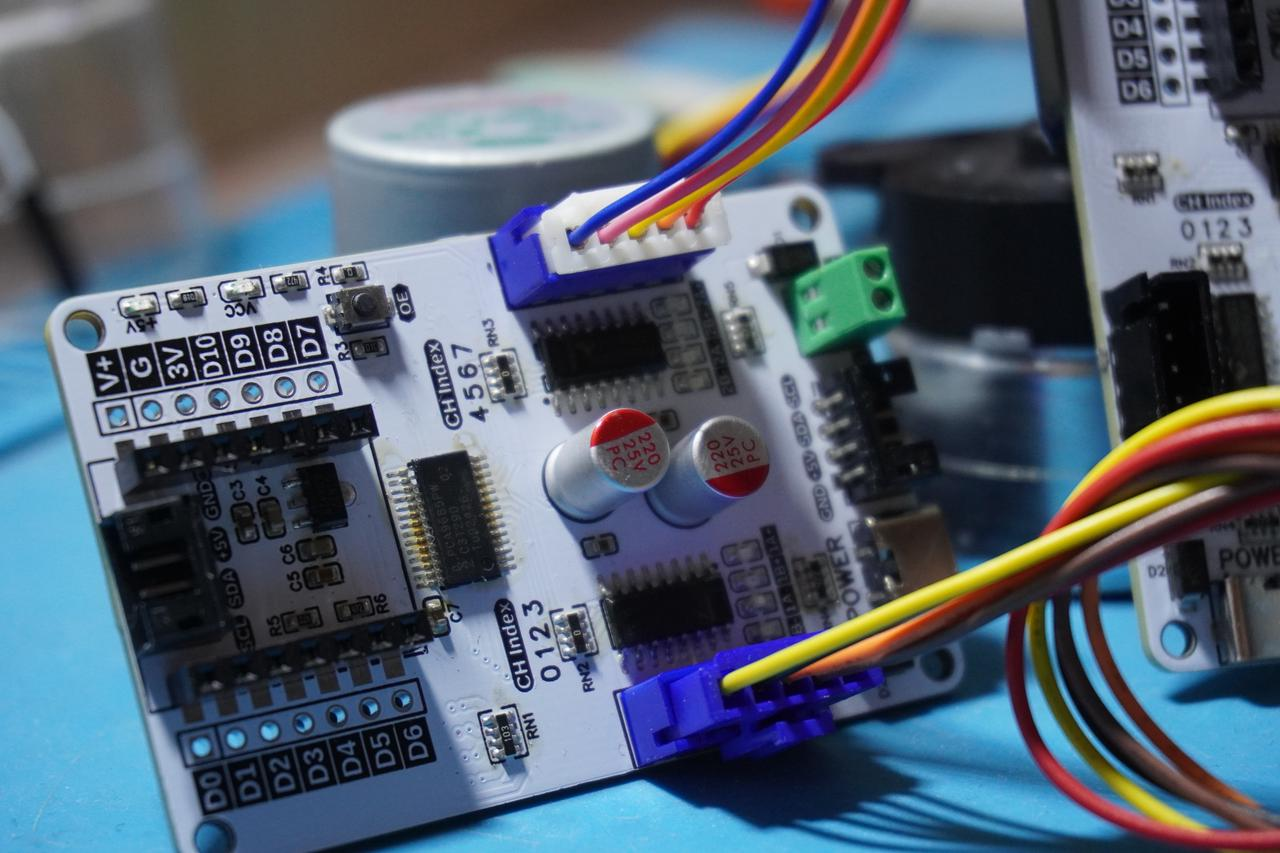 - 多电机独立控制:单块PCA9685最多支持2个步进电机(每个电机占用4个PWM通道),每个电机可独立设置方向、速度、驱动模式和运动模式。