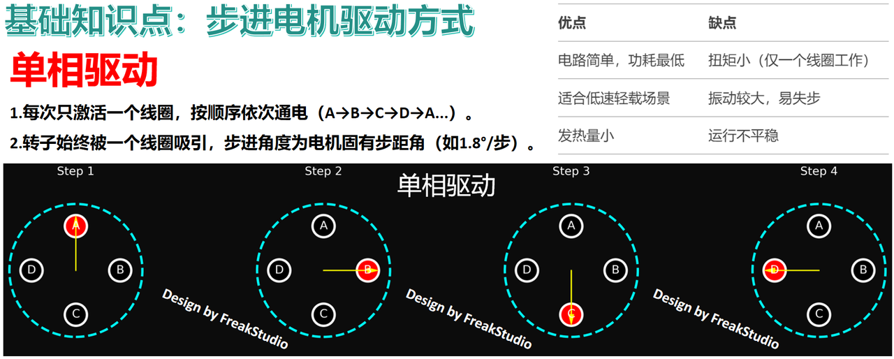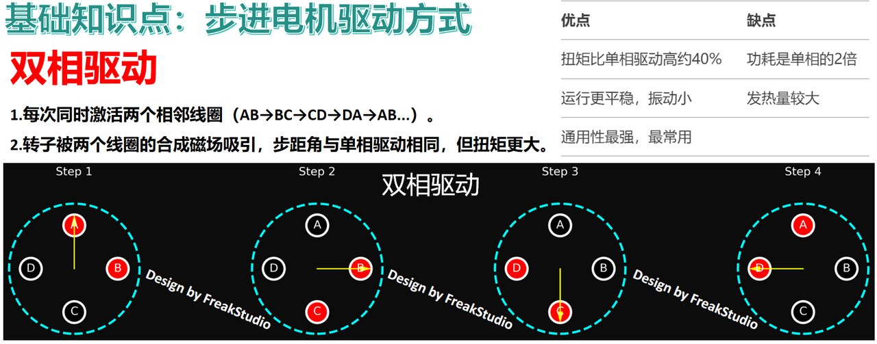 - 三种驱动方式:单相驱动(Single Phase),低功耗,扭矩较小;双相驱动(Double Phase),高扭矩,适合重负载;半步驱动(Half Step),更高分辨率,运动更平滑。