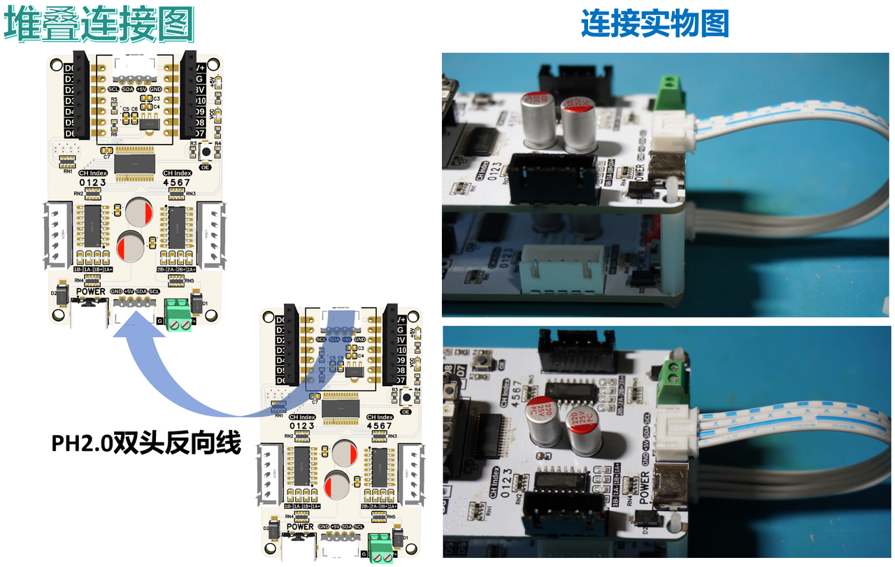 多个扩展板也可以堆叠连接,此时使用扩展板下方靠近供电端子部分的 I2C 通信接口与扩展板上方靠近供电端子部分的 I2C 通信接口相互连接,连接时需要注意线序,这里需要使用 PH2.0 双头反向连接线,我们这里使用 M2 塑料柱将两个扩展板进行固定:
