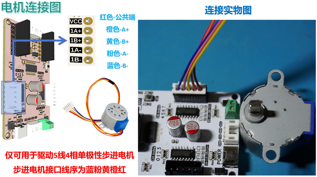 本扩展板采用 XH2.54-5P 接口连接 5 线 4 相单极性步进电机(如 28BYJ-48),此标准化接口设计可兼容市面上常见的 5 线 4 相步进电机,公共端(红色线)需连接至电机供电,如下图所示: