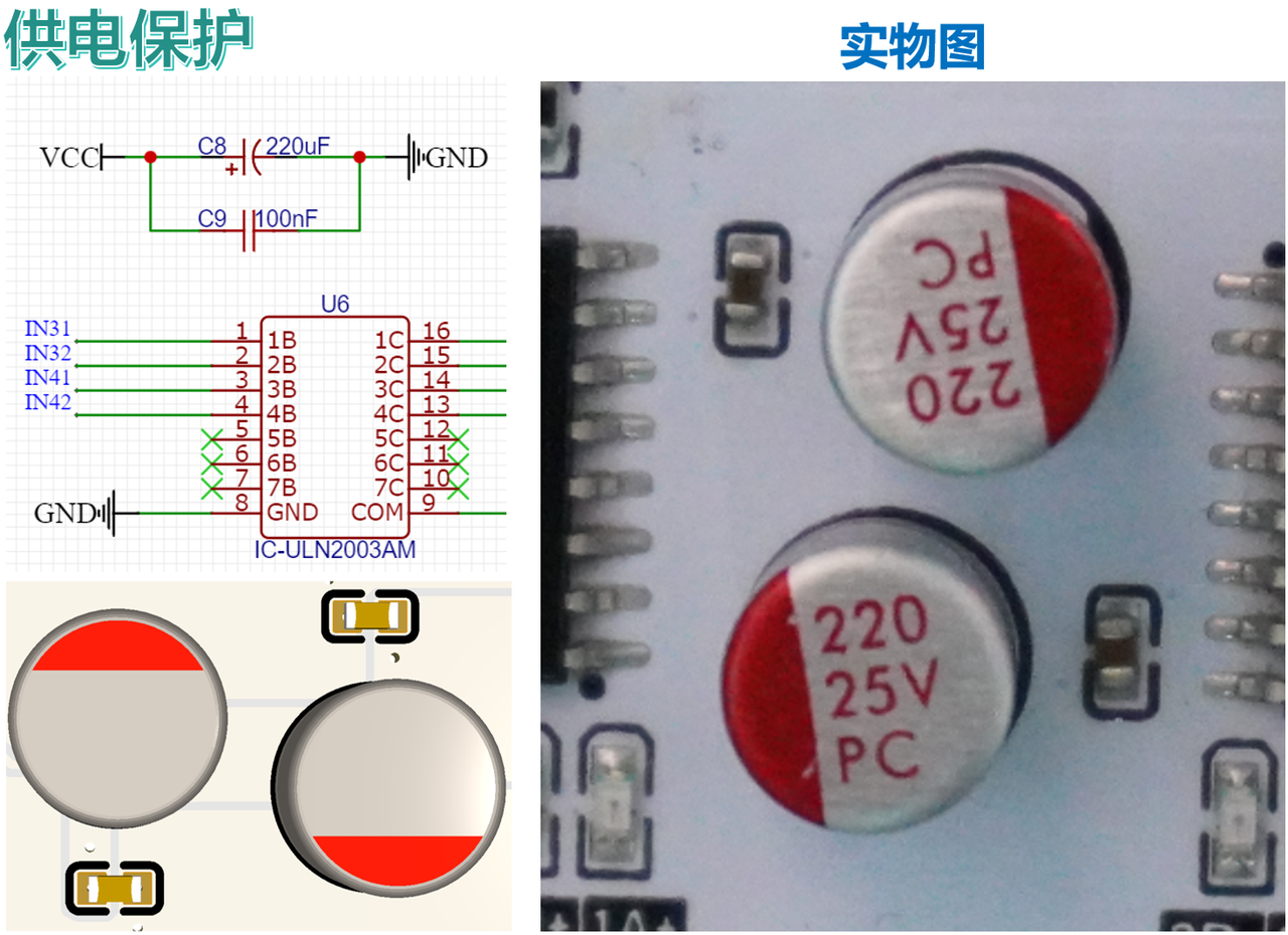 我们使用 220uF 固态电容作为稳压元件,固态电容具有较低的等效串联电阻和快速的电荷释放能力,对高频信号的阻抗更低,能够更高效地滤除高频噪声,相比传统电解电容在高温下具有更稳定的性能和更长的使用寿命,配合 100nf 小电容给达林顿管芯片进行稳压,快速消除达林顿管(ULN2003)开关瞬间的瞬态干扰,适合步进电机启停频繁的应用场景: