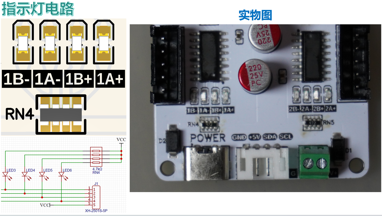 我们对步进电机驱动的四个控制通道都配备了指示灯,通过 4.7K 上拉电阻连接到 VCC,当某个通道导通时,对应 LED 指示灯点亮:
