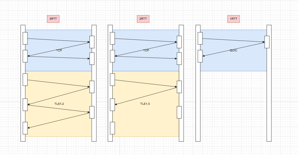 HTTP/2摆脱不了TCP,建立握手需要2-3个RTT,而QUIC只需要一个RTT