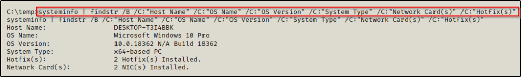 1. systeminfo | findstr /B /C:"Host Name" /C:"OS Name" /C:"OS Version" /C:"System Type" /C:"Network Card(s)" /C:"Hotfix(s)"