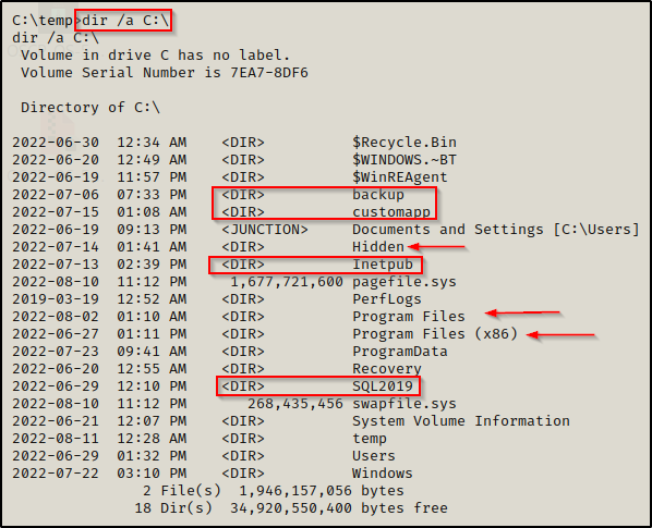 • 第 2 条命令只是简单地显示 C:\ 目录下的所有文件/目录(包括隐藏的)。注意,任何非默认或隐藏的文件/目录都应该更深入地探索。