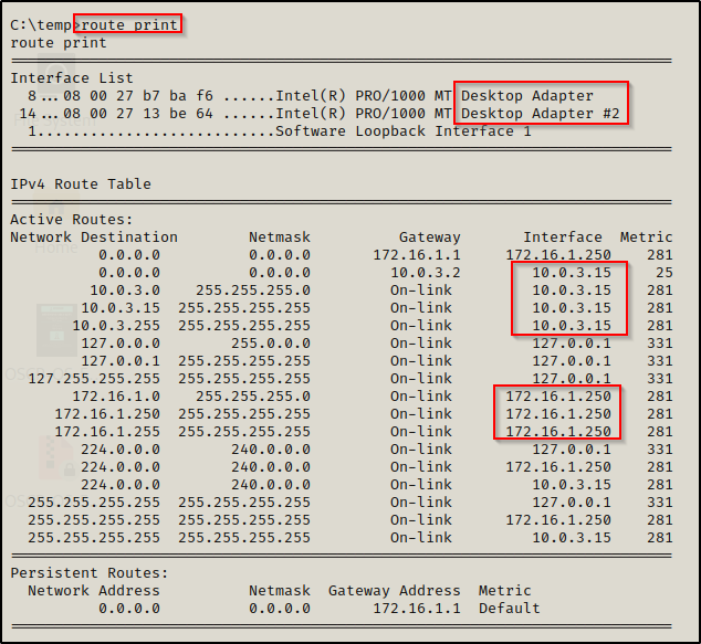 可以看到,当前这台机器能够通往两个不同的网络,分别是 10.0.3.0/24 和 172.16.1.0/24 网络。
