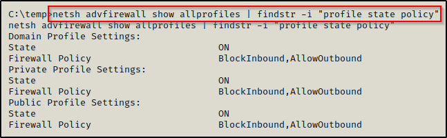 1. netsh advfirewall show allprofiles | findstr -i "profile state policy"