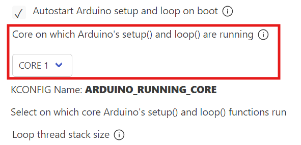最简单的解决方法就是禁止任务看门狗(task_wdt 取消任务订阅),这样就不会触发了。做法是在 setup 函数中调用 disableCoreXWDT 函数,其中,X表示 CPU 的核,即 loop 函数所在核,这个通过 ARDUINO_RUNNING_CORE 选项可以配置,默认是第二核,即 Core1,如下图所示。
