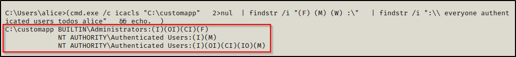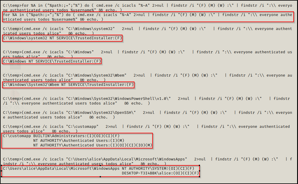 在手动枚举期间,通过 for 循环快速检查 PATH 环境变量中的目录权限:- for %A in ("%path:;=";"%") do ( cmd.exe /c icacls "%~A" 2>nul | findstr /i "(F) (M) (W) :" | findstr /i ":\\ everyone authenticated users todos %username%" && echo. )