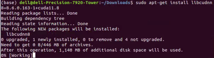 随后,我们继续在终端中输入如下的代码,同样记得修改自己的版本号。这句代码的作用是安装开发者库。sudo apt-get install libcudnn8-dev=8.x.x.x-1+cudaX.Y 复制代码 如下图所示,就是我这里输入的具体内容。
