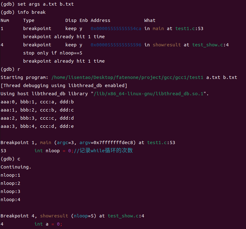 命令解析break function在进入指定函数时停住break n在指定行号停住,如(gdb) break 46break +offset/-offset在当前行号的前面或后面的offset行停住。offiset为自然数。break filename:linenum在源文件filename的linenum行处停住。break filename:function在源文件filename的function函数的入口处停住。break *address在程序运行的内存地址处停住,如如:(gdb) b *0x804835c。break条件判断比如break showresult if nloop==5watch 变量相当于给变量设置断点,每当变量发生变化就断在那里4.断点的删除