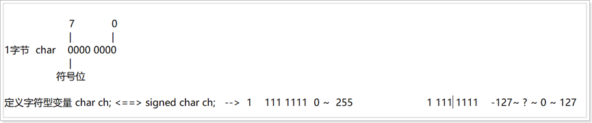 字符型: char  1字节 -- 有符号 -- 数值范围 -128 ~ 127  --  无符号 -- 数值范围 0 ~ 255