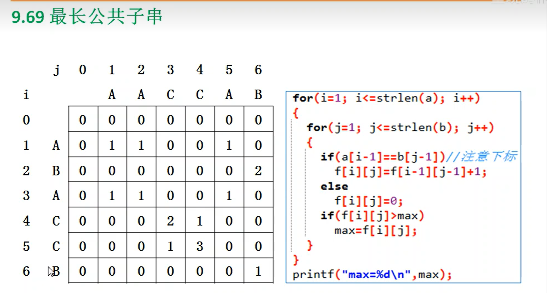 - 只有当两个字符串中的字符连续相等的时候,公共子串的长度才不断增加,否则清零