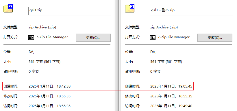 还记得前面压缩包名的验证吗,复制文件和源文件的MD5一致,也变相验证了文件MD5不受压缩包的 创建时间 的影响