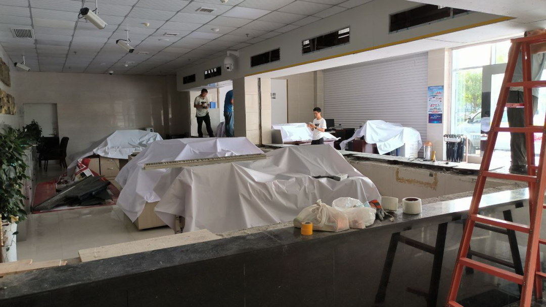 直到晚上,工人都还没有完成工作。防弹玻璃是拆了,不过还有很多灰,还拆了一部分窗台台面。感觉明天上不了班了…… 话说这些白布铺把桌子一搭,太平间的感觉瞬间就起来了(笑。