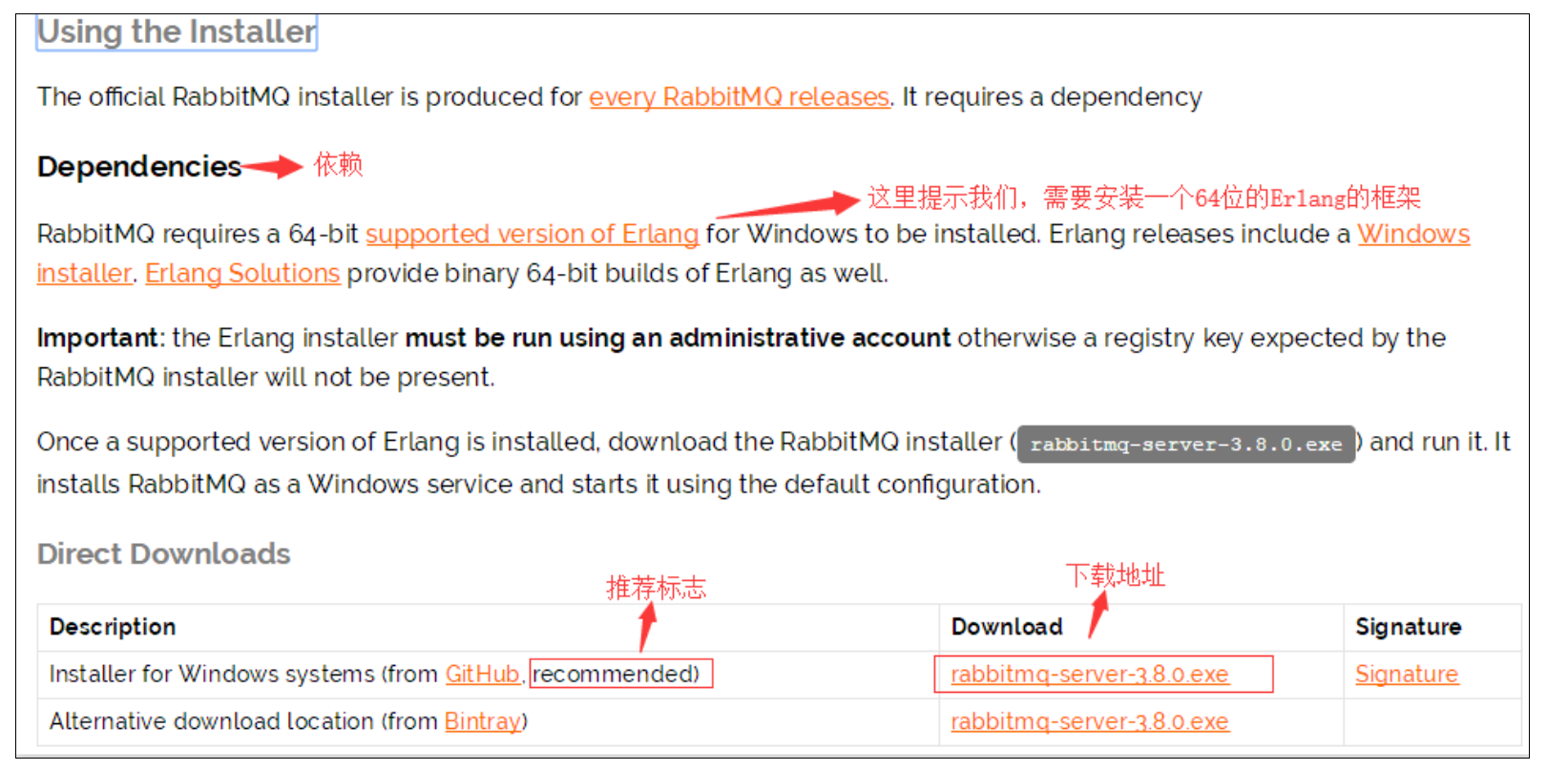 除了下载安装包,我们还会发现,在【Using the official installer】段落里,有提醒我们,RabbitMQ是有依赖的,依赖一个Erlang语言的框架(类似于C#语言的NetFramework)。
