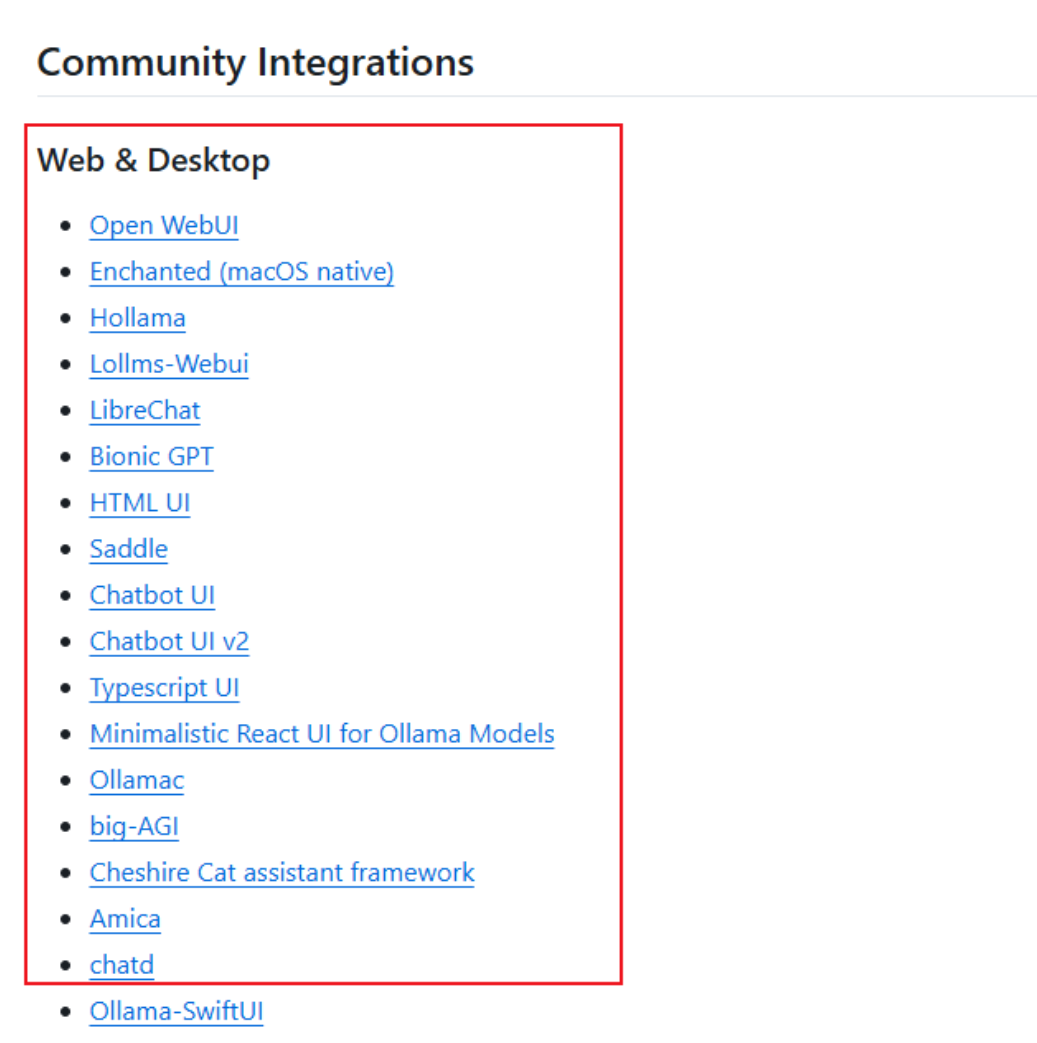 4、生态完善:众多开源Web项目、开源桌面软件支持Ollama,还有终端工具、移动应用、开发工具库等开源项目。