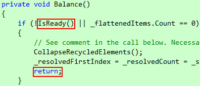 带着这个疑问,我从codeplex.com上下载了SL for WP Toolkit的最新代码(Change Set 57505),然后调试进去看看。在调试的过程中,我发现每次从NewOrEditAssignmentPage页返回AssignmentBookPage页时,LongListSelector控件都会调用Balance方法,但每次都会"跳过"本应执行的大部分代码,一开始我没怎么留意,觉得这个方法一下子就返回实在太神奇了,仔细观察,原来它是通过第一个if里的return悄悄返回的:
