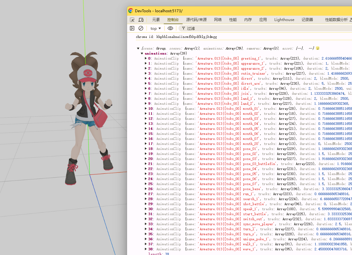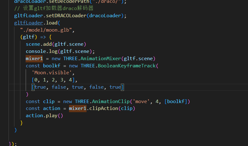 在这个对象里面,注意后期都是直接通过可视化软件Blender编辑好关键帧就能实现动画,这也是个已经编辑好的动画模型,在这个对象里面有一个animations就是动画集,也就是这个物体可以有很多个动画