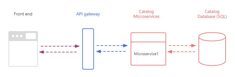 这里所说的同步通信与我们在编程语言中(例如Node.js中的同步与异步)所遇到的同步是两个不同的概念。在前端应用程序通过API网关调用后端服务的过程中,有时我们需要等待服务器马上返回结果,而不是将该请求发送到消息队列,然后服务器在处理完之后再返回结果。例如eShopOnContainers中有一个需要显示前10个最受欢迎的商品的功能,它是通过API网关向Catalog微服务发送一个请求,然后Catalog微服务从数据库中获取对应的数据并返回给前端应用程序。就整个过程而言,这是一种同步通信机制,因为前端应用程序在发送请求之后一直处于等待状态,直到后端服务返回结果,才进行下一步的动作(在网页上显示数据,或者给出错误提示)。