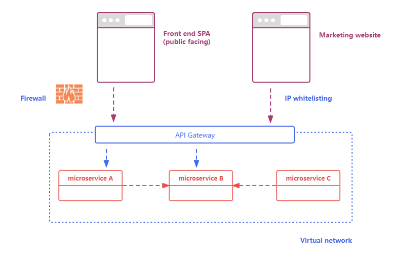 我们可以使用防火墙、IP白名单和虚拟网络等网络功能来共同保护我们的微服务。下图中,我们可以看到其中有三个相互通信的微服务,如果我们将其放到虚拟网络中,那么我们就有能力拒绝任何来自虚拟网络外部的访问请求,而只允许微服务之间彼此进行通信。这种方式可以很好地保护后端服务的网络安全,这些微服务可能只需要在它们之间进行通信,而不需要从外部直接访问。但是,如果确实存在需要从外部直接访问微服务的情况呢?例如,一个单页面应用程序(SPA),它可能需要直接访问某个微服务,这是否意味着我们需要放开虚拟网络对外部请求的限制而允许访问某些微服务呢?有关这一点我们在前面“微服务通信模式”一节中已经讨论过了,一个好的实践方式是使用API网关将外部请求与虚拟网络中的微服务隔离开,这样我们就可以非常有选择性地确定哪些API可以从外部访问,哪些API不能从外部访问。而且,单一的访问入口也有利于对API网关配置防火墙,以防范DDOS攻击和SQL注入等。