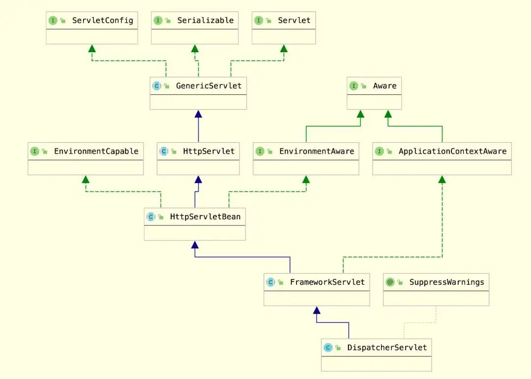 有了上面的分析基础,再以SpringMVC DispatcherServlet为例,分析它的设计思想,它的类图结构如下图所示。