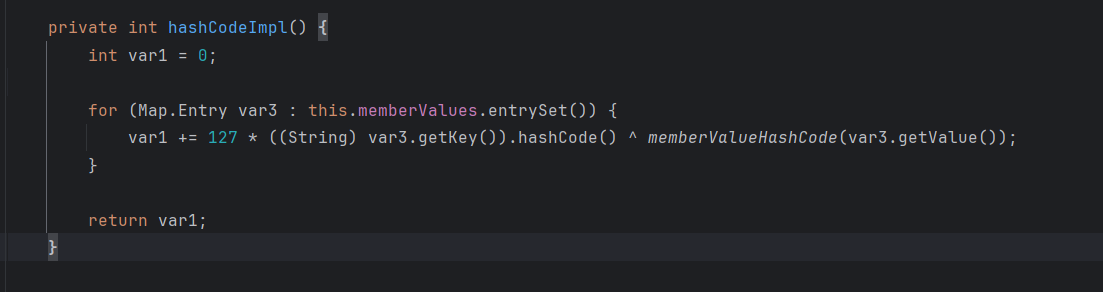 而在反序列化过程中,调用proxy.hashCode()会调用AnnotationInvocationHandler的invoke,从而调用 hashcodeImpl()