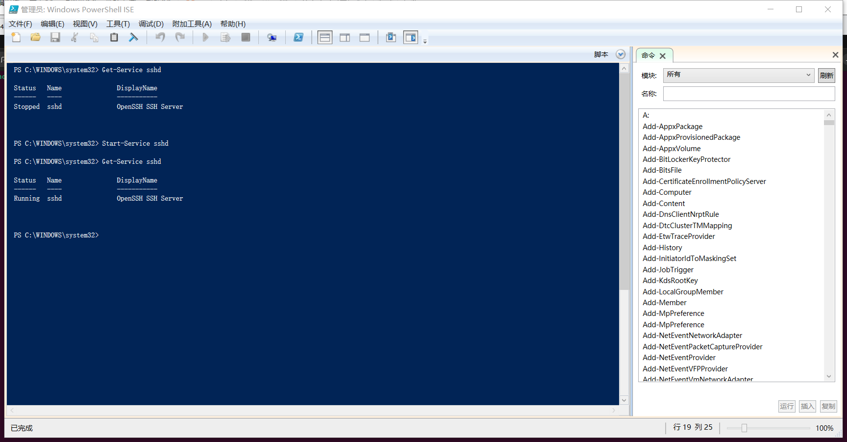 命令同上,只不过需要去cmd里面输入ipconfig查看当前Windows下面的IP,还需要去Windows应用里面添加可选功能,找到跟SSH相关的并添加,最后用PowerShell打开服务。