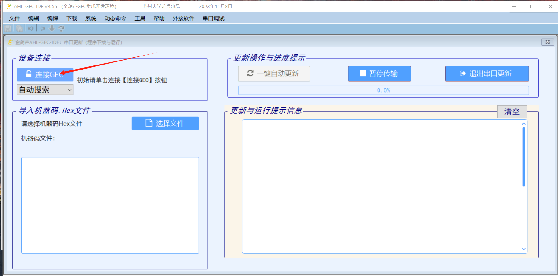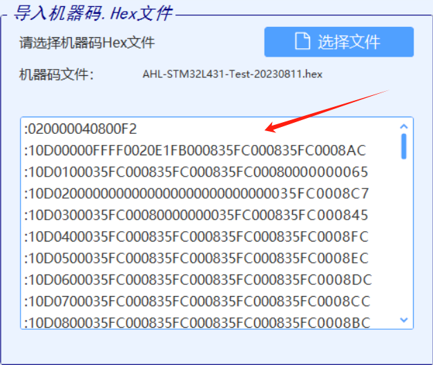 认识一下机器码,机器码能干嘛?直接开整,点击选择文件按钮导入被编译工程目录下的Debug中的.hex文件,然后单击“一键自动更新”