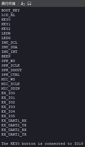 可以看到,“串行终端”串口中显示打印了板卡的所有属性信息,例如LEDR、BEEP等,只需要通过board_info.{key}便可以获取board_info类中key属性的值value,这个value就是对应的IO编号,例如上图“串行终端”窗口的最后一行显示KEY0按键连接到了IO18,通过对比第10.2.3小节《原理图》中的原理图,可以验证是一致的。