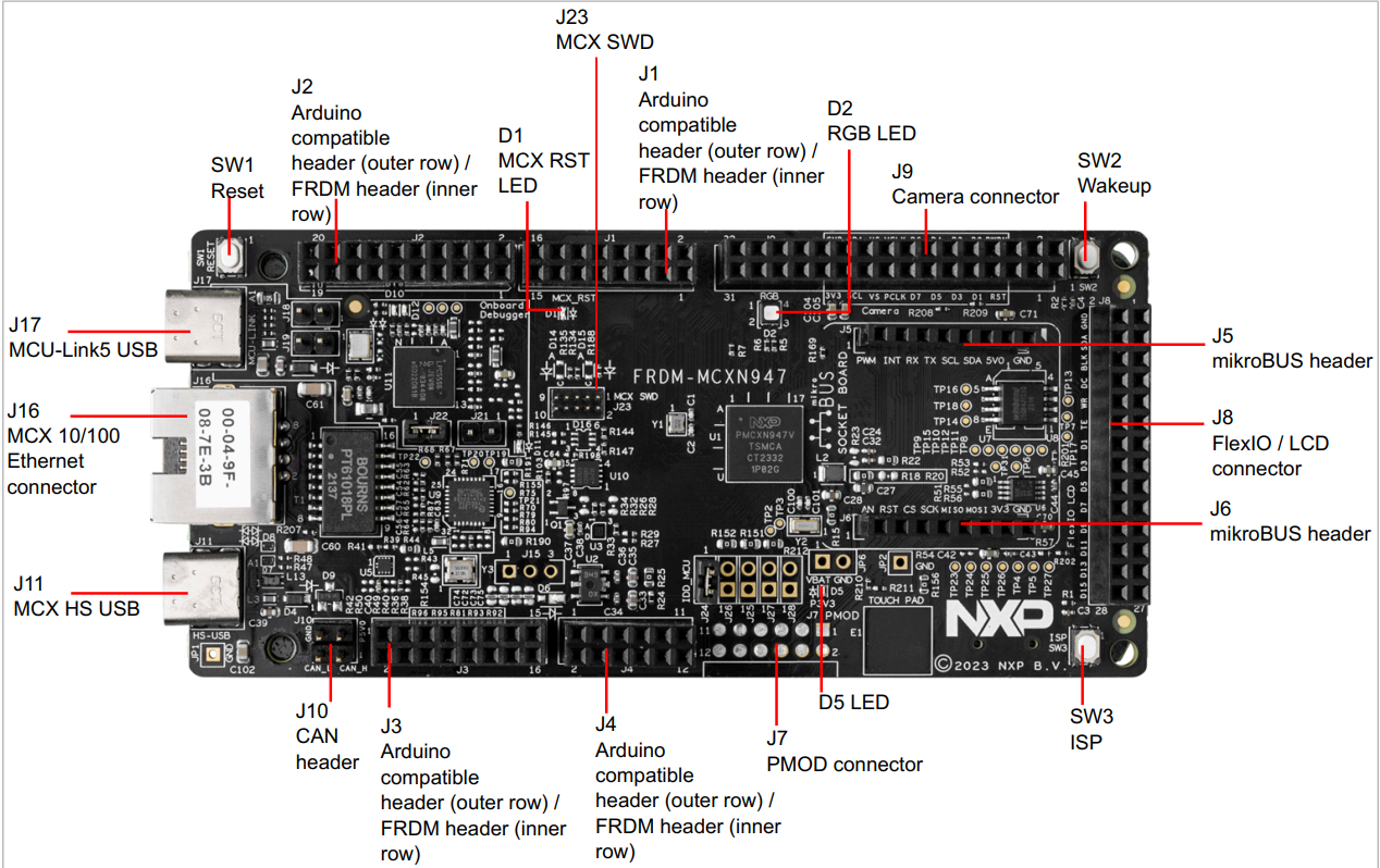 NXP FRDM-MCXN947开发板是一款基于MCXN947 MCU的低成本评估板,MCU集成了双核Arm Cortex-M33微控制器和一个神经处理单元(NPU)。开发板由一个MCXN947控制器和一个64 Mbit外部串行闪存组成。该板还具有P3T1755DP I3C温度传感器,TJA1057GTK/3Z CAN PHY,以太网PHY, SDHC电路(卡槽为DNP), RGB LED,触摸板,高速USB,按钮,和MCU-Link调试接口。该板兼容Arduino屏蔽模块,Pmod板,mikroBUS。该板还支持摄像头模块和NXP低成本LCD模块PAR-LCD-S035