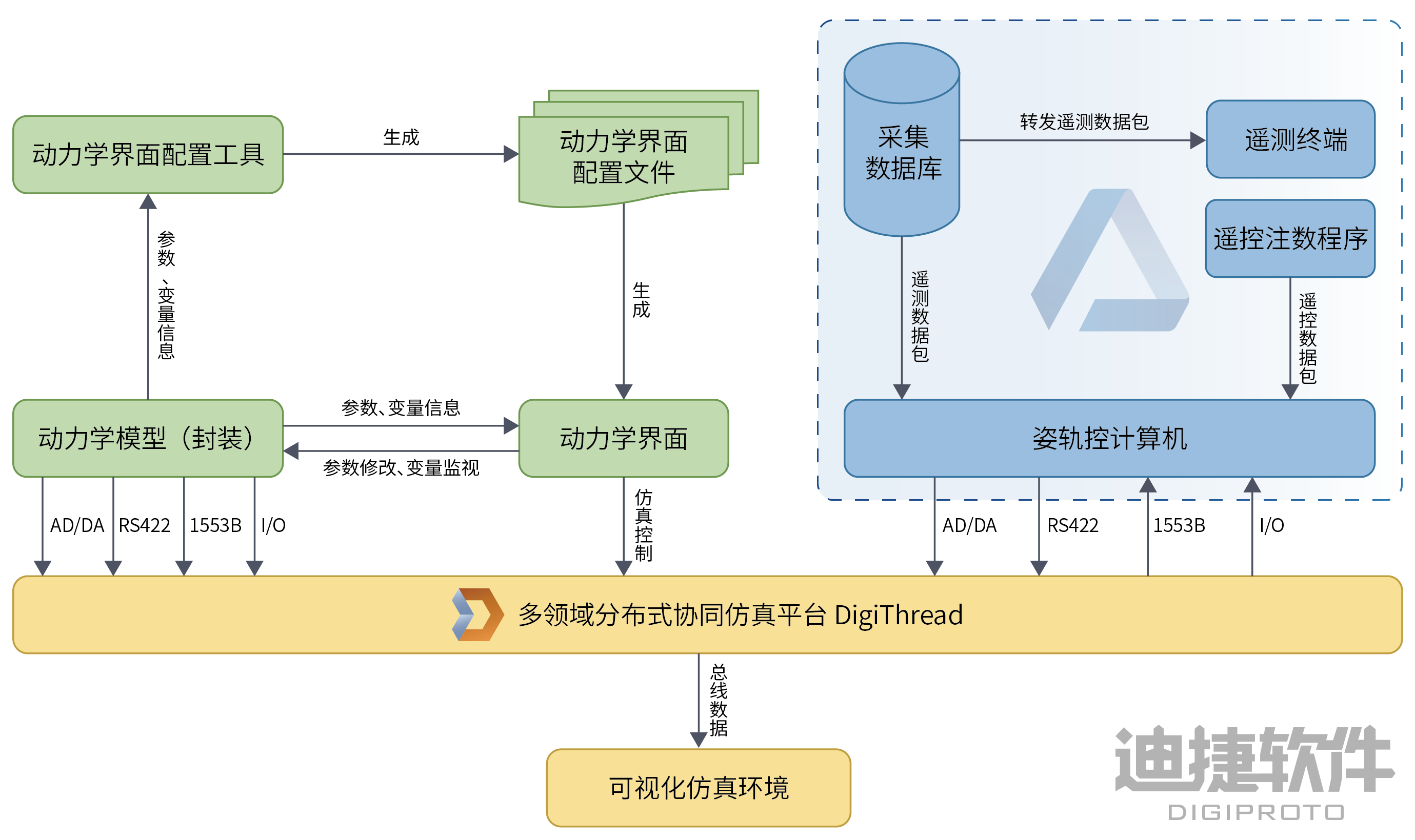SkyEye可与多领域分布式协同仿真平台DigiThread 联动,实现动力学模型、姿轨控模型与计算模型的协同运行。整套系统支持超实时仿真,可进行可视化参数调节与故障注入测试,“数字卫星”得以实现。实际应用中,SkyEye构建的数字卫星可实现系统性能提升3倍以上,仿真速度提升5倍,同时支持对任意变量进行动态监控,显著缩短开发周期。