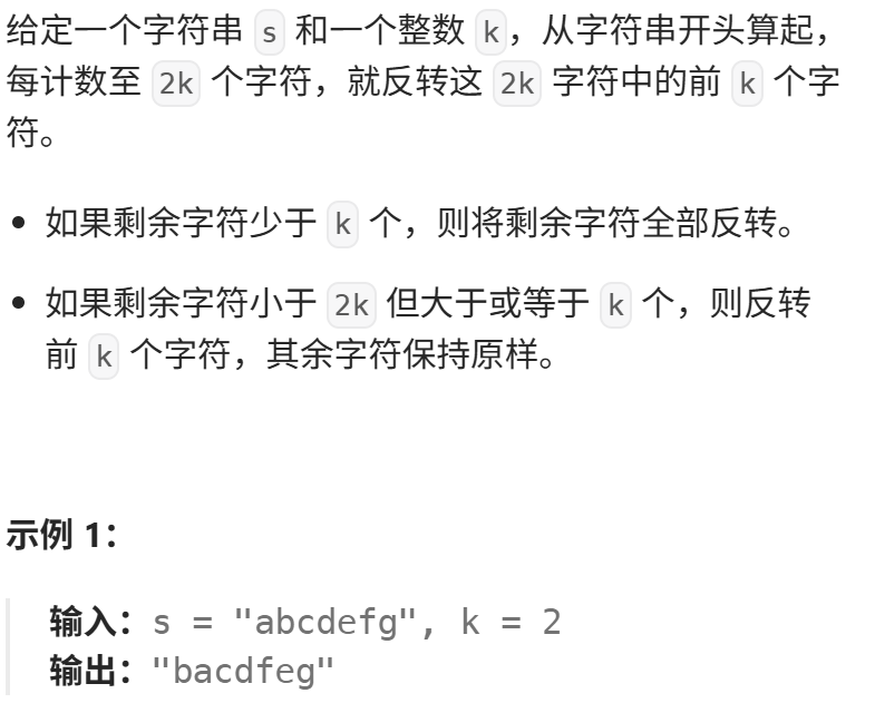 题目要求每隔 2k 个字符就反转前 k 个字符,剩下的部分按规则处理。可以直接对原字符串转为字符数组,在原地进行操作。