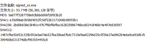 10.signed_xz.exe程序SHA1后6位是多少?[标准格式:524c62]