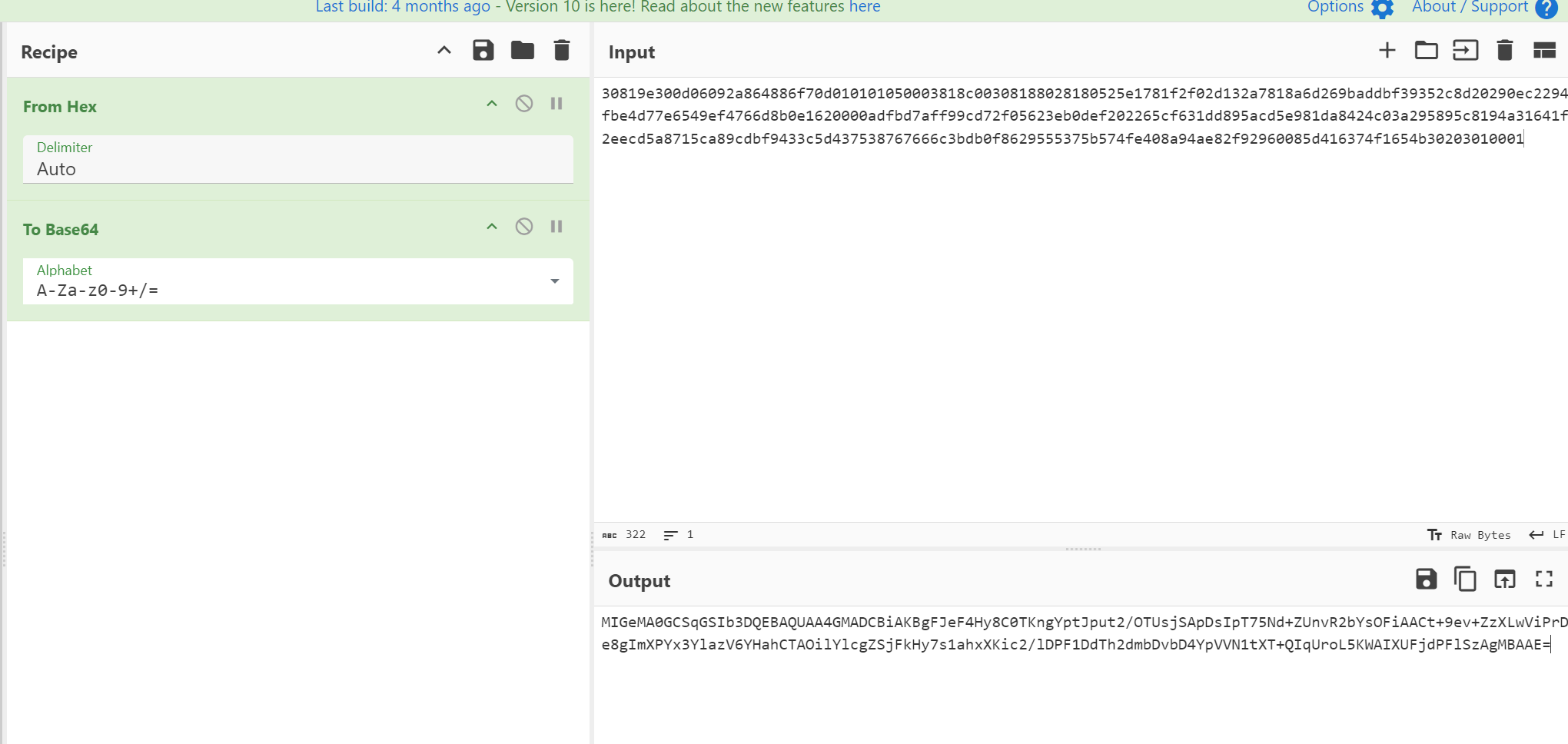 复制代码 from hex to base64- MIGeMA0GCSqGSIb3DQEBAQUAA4GMADCBiAKBgFJeF4Hy8C0TKngYptJput2/OTUsjSApDsIpT75Nd+ZUnvR2bYsOFiAACt+9ev+ZzXLwViPrDe8gImXPYx3YlazV6YHahCTAOilYlcgZSjFkHy7s1ahxXKic2/lDPF1DdTh2dmbDvbD4YpVVN1tXT+QIqUroL5KWAIXUFjdPFlSzAgMBAAE=