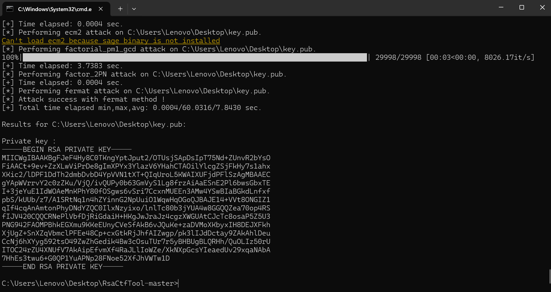 复制代码 终端命令- python RsaCtfTool.py --publickey ./key.pub --private