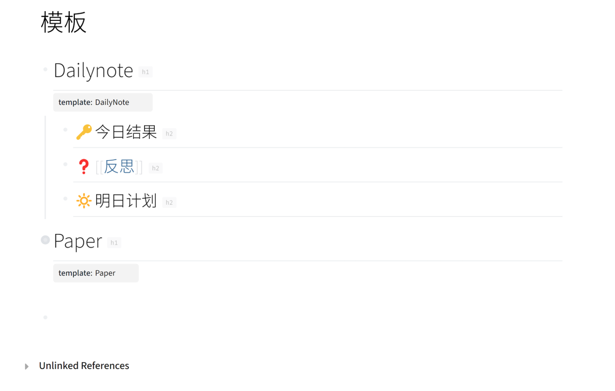 作为一个科研人,我最需要记录的就是每天实验结果,分析失败的原因,然后列举明天要做的实验,所以我新建了一个名为模板的页面,在其中,我用一级标题将这个模板的名字命名为Dailynote(英文是因为到时候引用模板的时候方便),然后在其下方,列了三个小标题,今日结果、反思和明日计划,就这么简单,不需要多么花里胡哨的模板。为了让它稍微美观一些,我用了emoj小表情,这个需要安装一个emoj表情小插件。