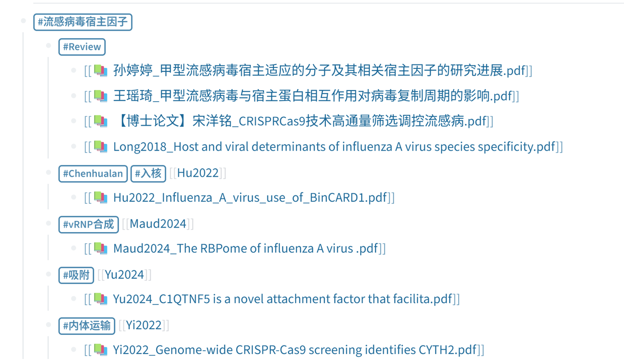 - 方便的在页面下进行归类,比如某天我想看一下,我看过哪些和内体运输相关的文献,我只需要点击内体运输的标签,就可以看到所有的相关文献就被双链归类到这里了,这个积累的过程是无痛的,既方便检索,又方便总结归纳。