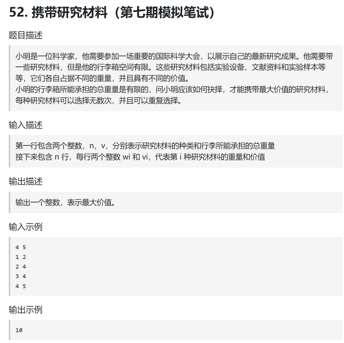 [code]import java.util.Scanner;public class Main { public static void main(String[] args) { Scanner scanner = new Scanner(System.in); int n = scanner.nextInt(); int bagWeight = scanner.nextInt(); int[] weight = new int[n]; int[] value = new int[n]; for (int i = 0; i < n; i++) { weight = scanner.nextInt(); value = scanner.nextInt(); } int[][] dp = new int[n][bagWeight + 1]; // 初始化 for (int j = weight[0]; j