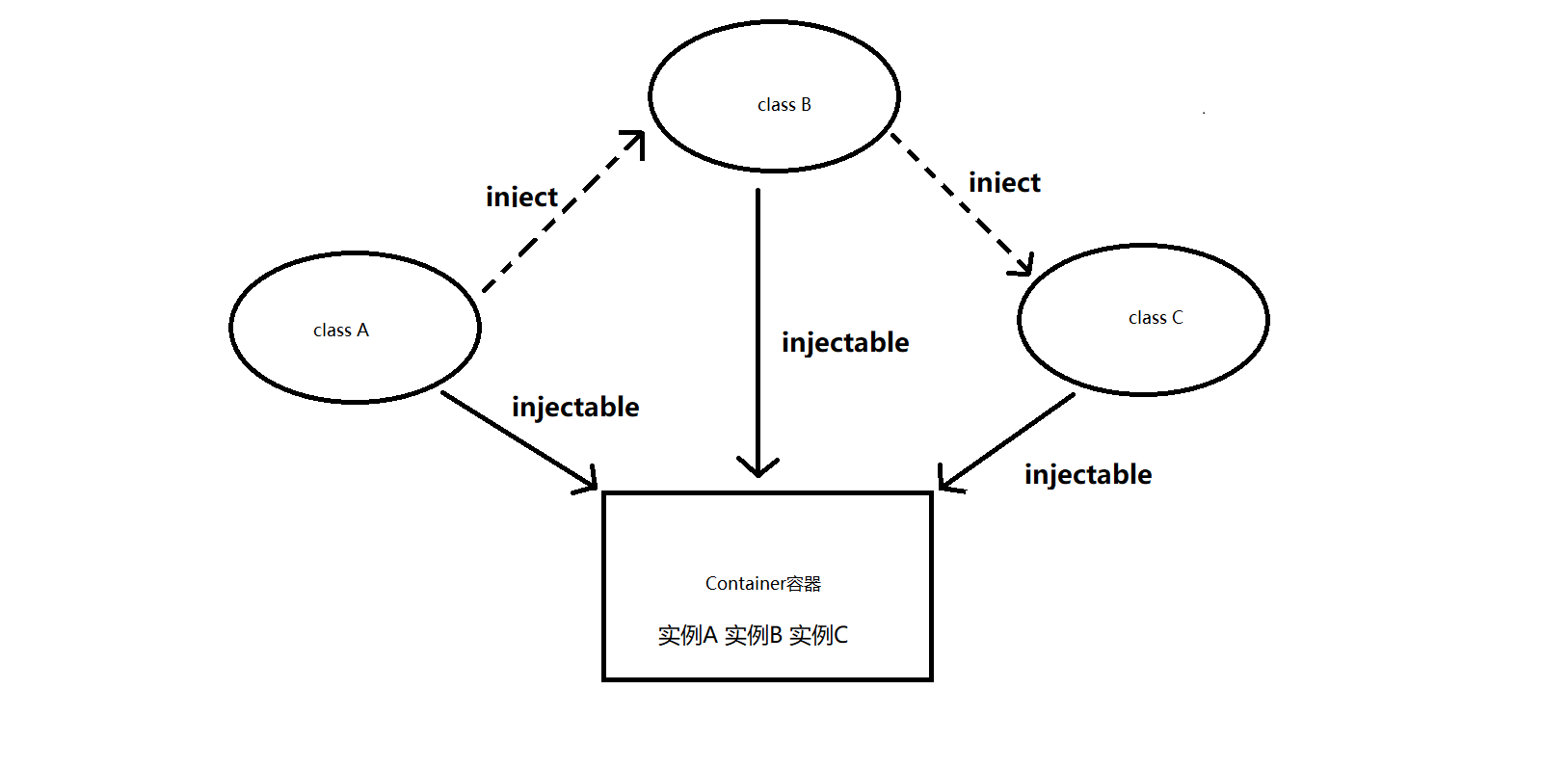 2、 class A 虚线指向 classB,代表 class B 需要注入 classA 作为实例化的参数; class B 指向 class C 同理