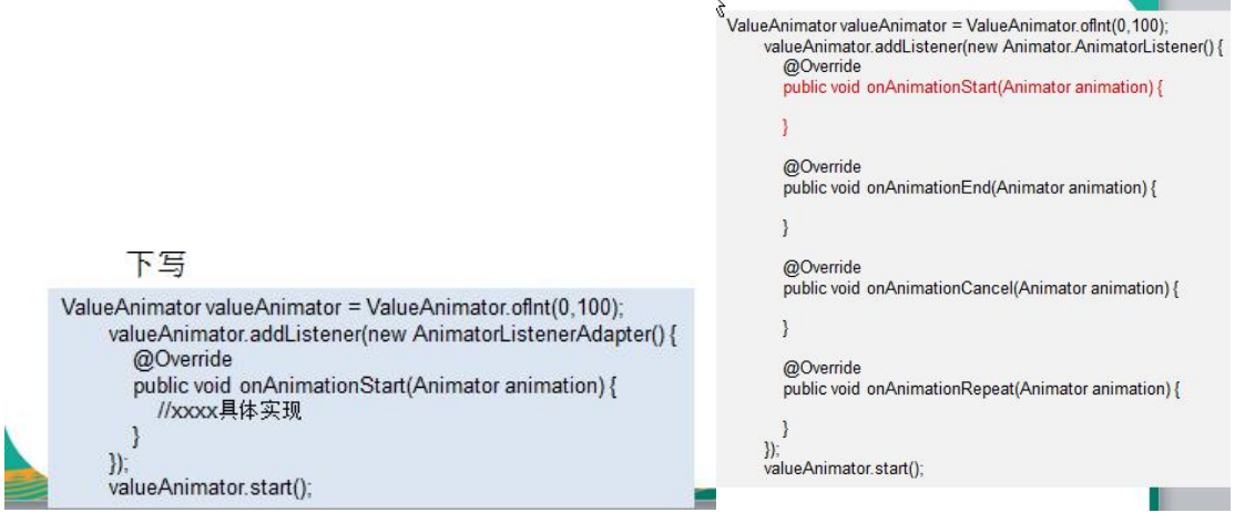- 1.Android中的属性动画ValueAnimator类可以通过addListener(AnimatorListener listener)方法添加监听器,常规方法如下右图。