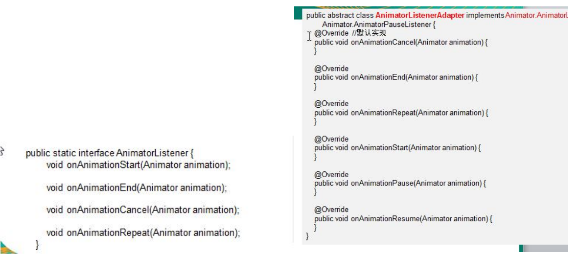 - 3.AnimatorListenerAdapter类,就是一个接口适配器,代码如下 右图。