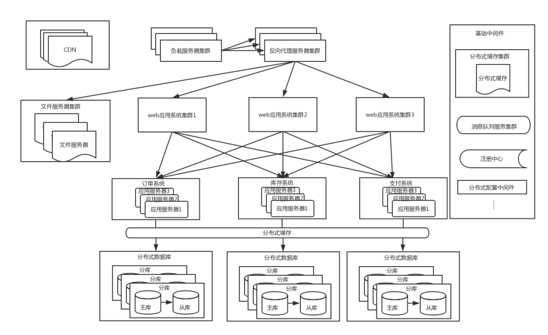 随着业务量增大,一些核心系统数据库单表数量达到几千万甚至亿级,这时候对该表的数据操作效率会大大降低,并且虽然有缓存来抗读的压力,但是对于大量的写操作和一些缓存miss的流量到达一定量时,单库的负荷也会到达极限,这时候需要将表拆分,一般直接采用分库分表,因为只做分表的话,单个库的连接瓶颈仍然无法解决。分库分表后的架构如下: